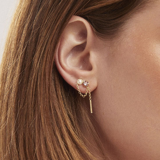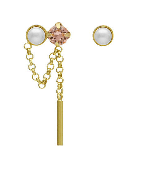 Pendientes desiguales rose vintage largos de plata con cadena y cristales en color rosa.